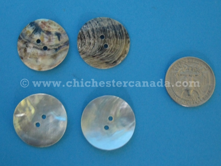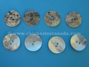Sometimes called agoya shell buttons, these are made from saltwater mother of pearl. They have two holes, very thin and slightly curved.