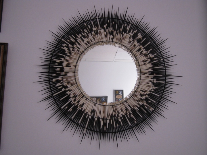 These are mirrors set into handmade frames made of African porcupine quills of varying lengths, creating a unique but simple sunburst design. The porcupine quills used are washed, sterilized, and fumigated according to international standards. They are threaded by hand on a black epoxy coated, wired, mirror frame.