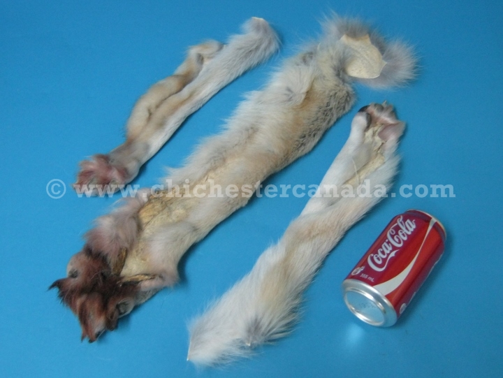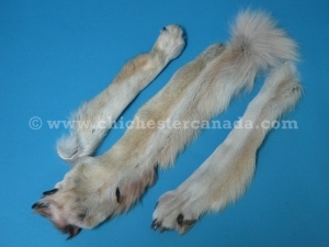 We have real timber wolf leg pieces. Lengths vary, and they may or may not have claws. We measured the longest piece from the above picture (middle) as 56 cm long, 11 cm wide and weighing 0.14 kg. The shortest piece (top) measured 37.5 cm long, 10 cm wide and weighing 0.05 kg.